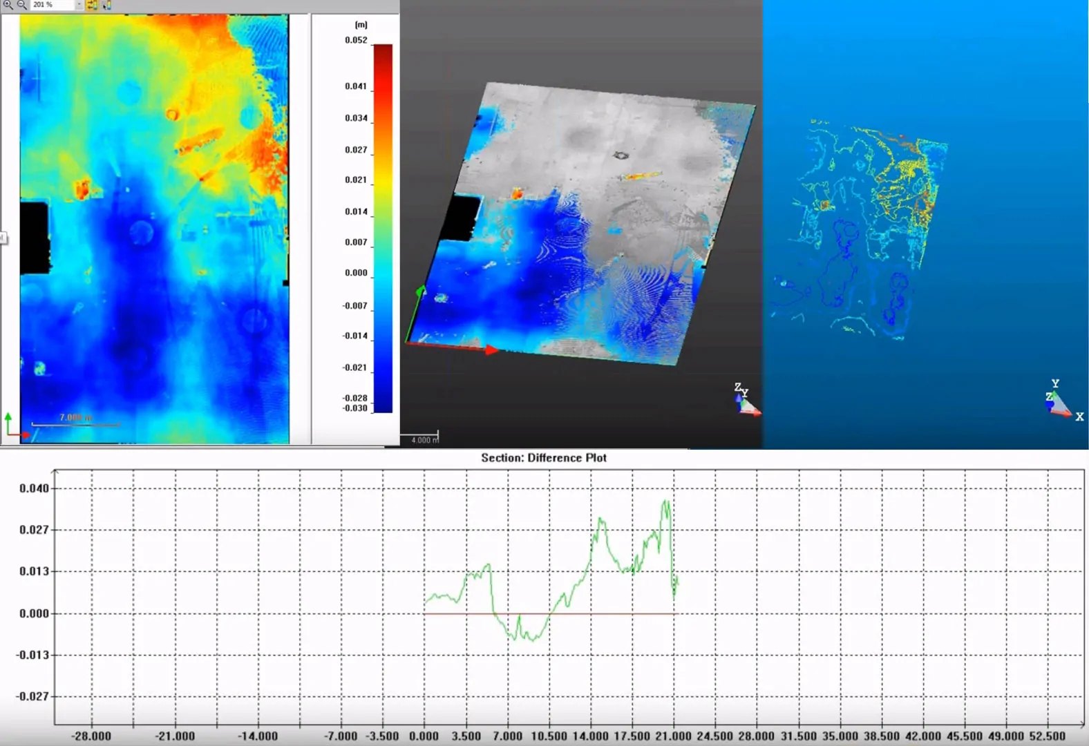 - Once the data has been brought back to the office, a point on the surface is selected and, using specialised software, the height deviation above and below that point is calculated.